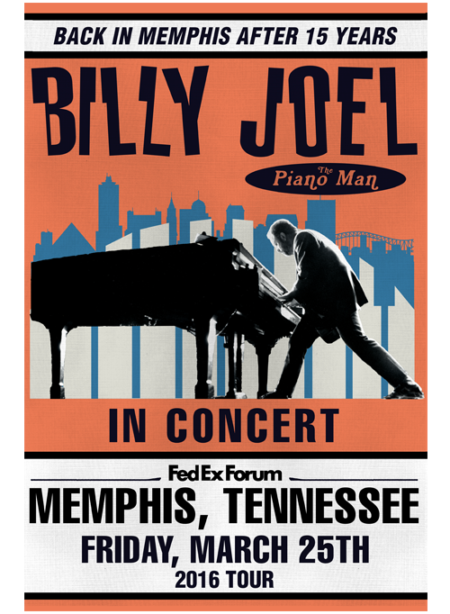Billy Joel's 12.5" X 17.5" 2016 Tour Poster for the Memphis, Tennessee Show for March 15th, 2016. Limited Quantities - get yours today!