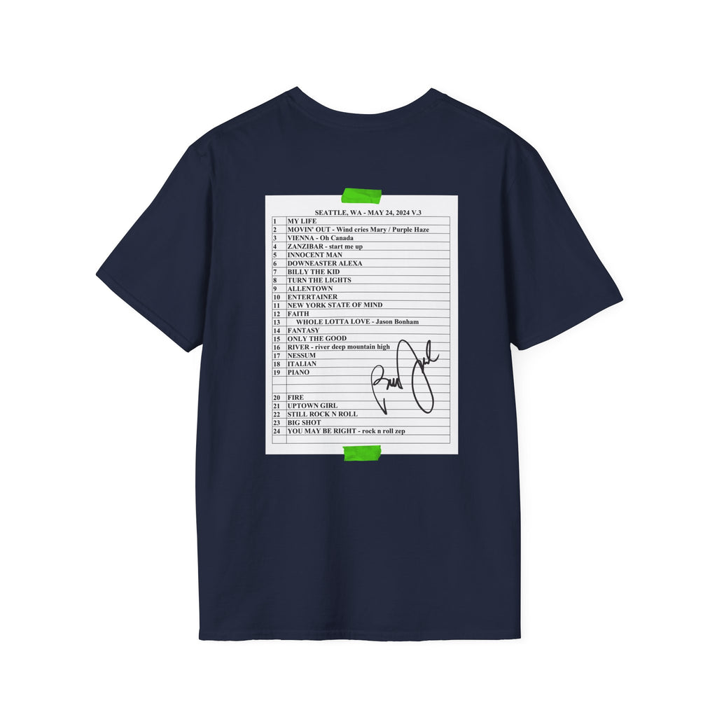 Special Edition, reissue of the hand signed set list for Seattle, WA on 5-24-24, duplicated onto the front and back of a navy blue t-shirt